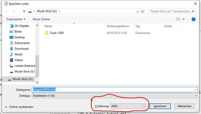 Ich musste also die aus iTunes exportierten „m3u“-Playlisten-Dateien von „UTF-8“ nach „ANSI“ konvertieren: